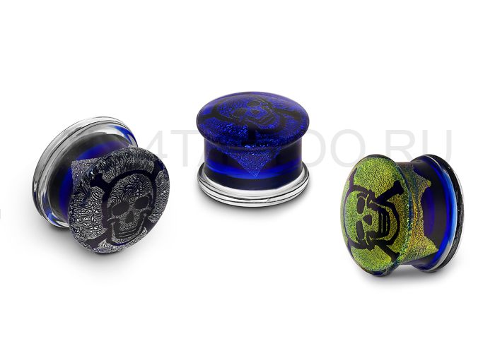 Плаги из боросиликатного стекла ручной работы с изображением черепа на переливающимся фоне. Рисунок каждого плага индивидуален.