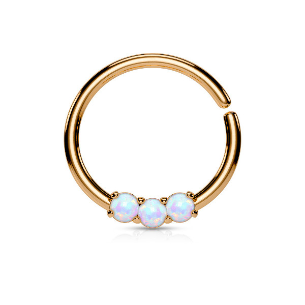 Раздвижное кольцо из хирургической стали 316L с титановым анодированием. Украшено тремя белыми синтетическими опалами.
