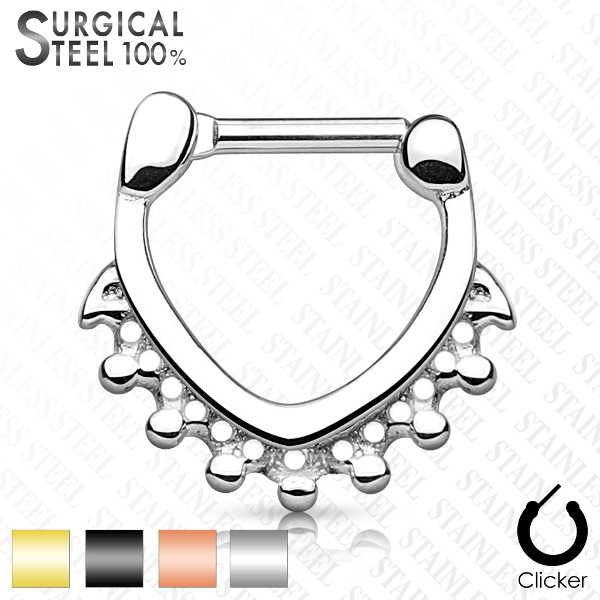 Треугольный кликер из хирургической стали 316L с черным и золотым IP покрытием.