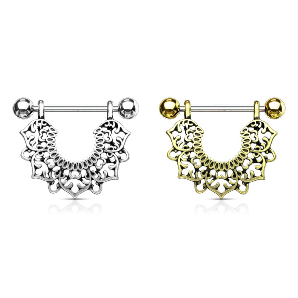 Украшение для груди со штангой из хирургической стали 316L и декоративной частью из родированной латуни. Представлена вариация с золотым покрытием.