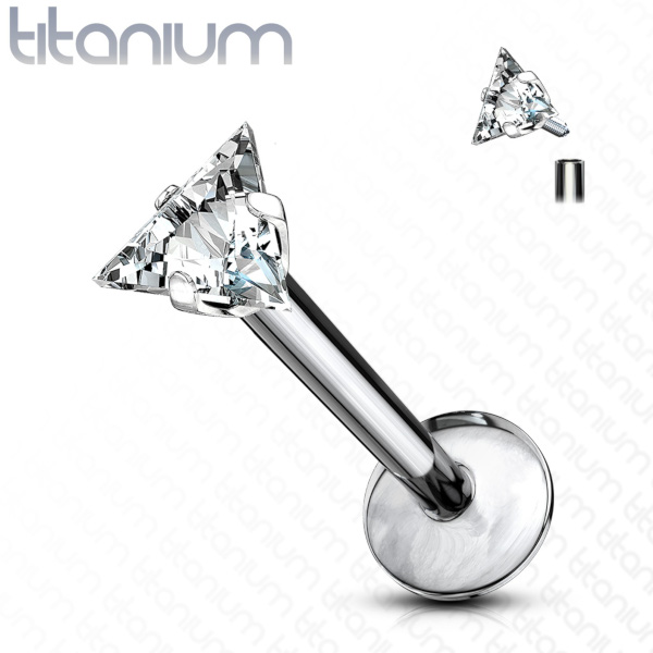 Лабрет из имплантационного титана 6Al-4V-Eli ASTM: F-136 с внутренней резьбой. Украшен прозрачным треугольным кристаллом.