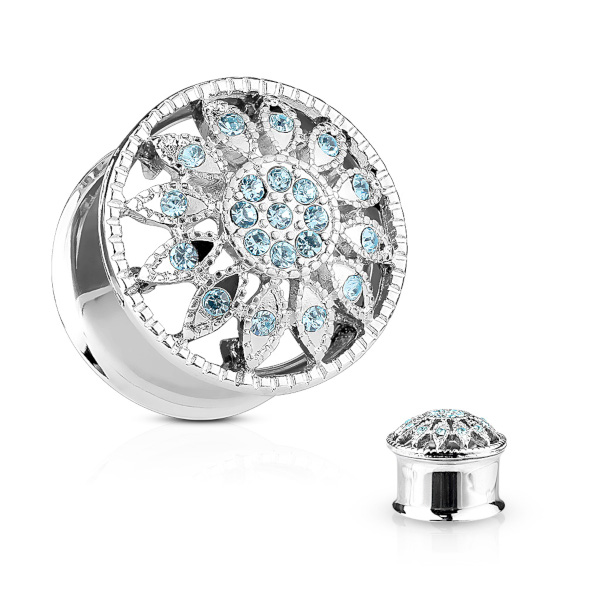 Тоннели с бортами из хирургической стали 316L с фасадом из родированной латуни, украшенным цветком из небесно-голубых страз.