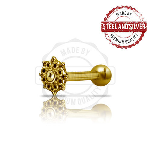 Микроштанга из хирургической стали 316L с внутренней резьбой. Представлена вариация с PVD покрытием 24х каратного золота. Диаметр цветка 4мм.