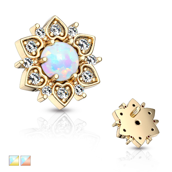 Наркутка диаметром 8мм из хирургической стали 316L и латуни украшена искусственным опалом в окружении 12ти фианитов. Резьба накруток 1,2мм подходят к микродермалам и украшениям толщиной 1,6мм с внутренней резьбой.