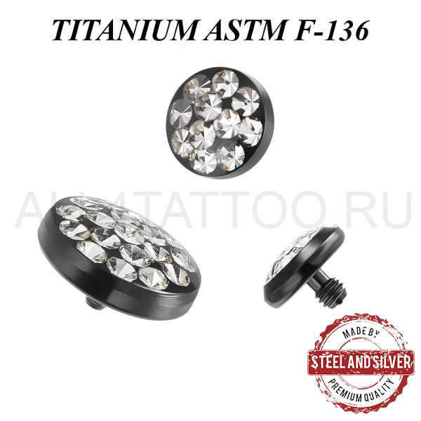 Накрутки из имплантационного титана ASTM F-136 с чёрным  PVD покрытием, украшенные прозрачными кристаллами Swarovski. Резьба накруток 1,2мм подходят к микродермалам и украшениям толщиной 1,6мм с внутренней резьбой.