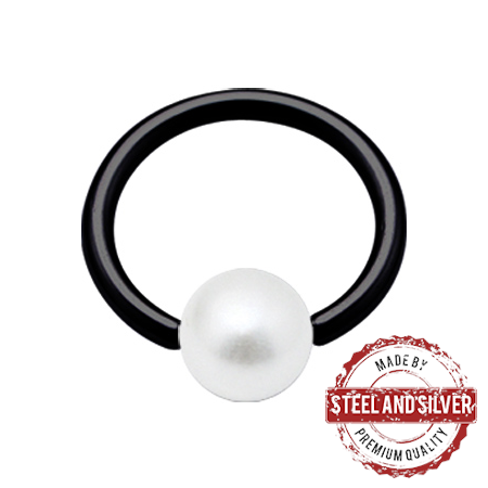 Кольцо из хирургической стали 316L с черным PVD покрытием. Дополнено акриловым шариком с перламутровым отливом.