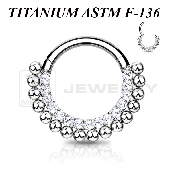 Кликер из имплантационного титана 6Al-4V-Eli ASTM: F-136 с рядом миниатюрных титановых шариков и сетом прозрачных фианитов. Представлен в двух вариантах: классический титановый и с золотым PVD покрытием.