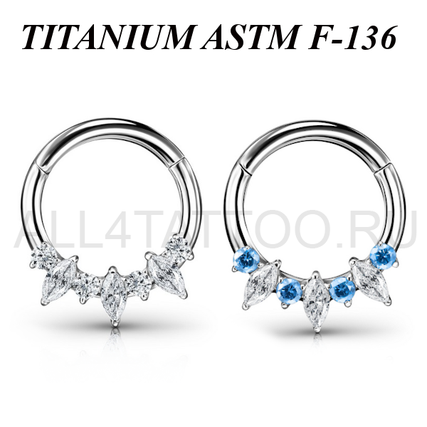 Кликер из имплантационного титана 6Al-4V-Eli ASTM: F-136. Предаствлен в двух вариантах: полностью прозрачные фианиты и чередующиеся синие с прозрачными фианиты.