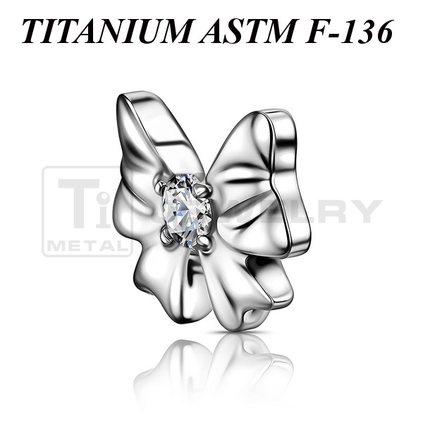 Фигурная накрутка из имплантационного титана 6Al-4V-Eli ASTM: F-136 в форме бантика. Украшена прозрачным фианитом. Размер накрутки: 8х6мм. Подходит для украшений с внутренней резьбой толщиной 1 и 1,2 мм