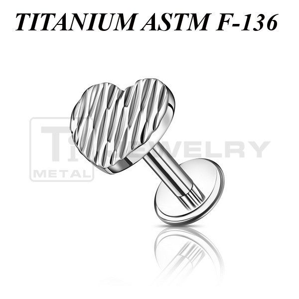 Лабрет из имплантационного титана 6Al-4V-Eli ASTM: F-136 с внутренней резьбой. С накруткой в форме сердца с рельефной поверхностью. Размер накрутки: 5,6х5мм.