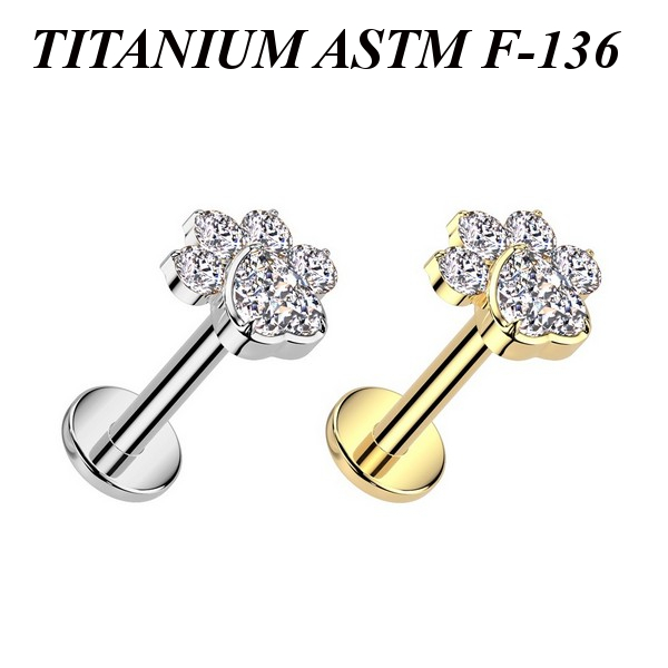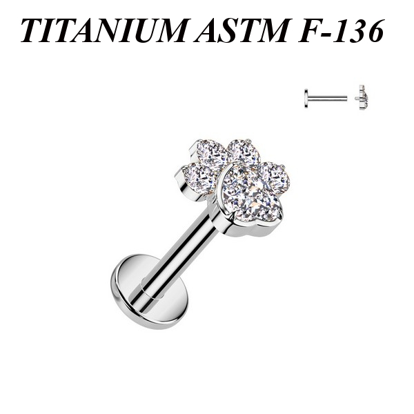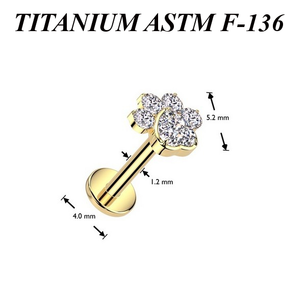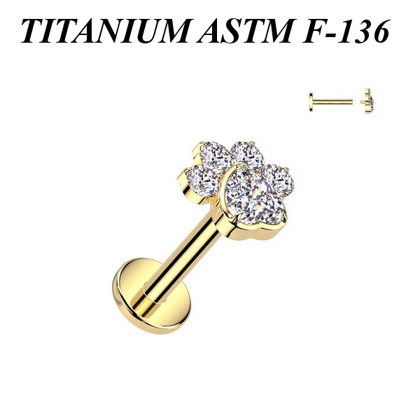 Лабрет с внутренней резьбой из имплантационного титана 6Al-4V-Eli ASTM: F-136. Украшен накруткой с прозрачными фианитами. Представлен в двух вариантах: классический титановый и с золотым PVD покрытием.