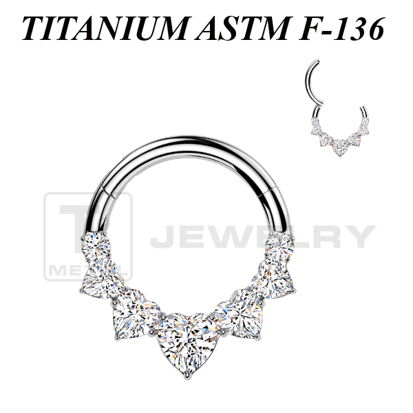 Кликер из имплантационного титана 6Al-4V-Eli ASTM: F-136 с прозрачными фианитами в форме сердец.