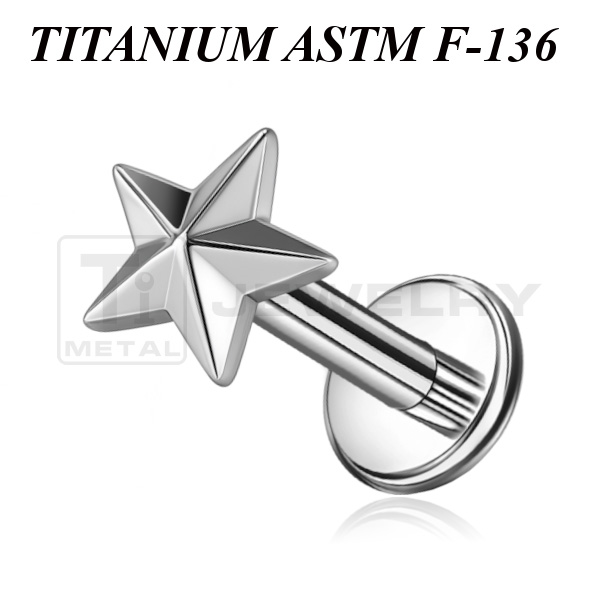 Лабрет из имплантационного титана 6Al-4V-Eli ASTM: F-136 с внутренней резьбой. Украшен фигурной накруткой в виде звезды с гранями. Диаметр накрутки: 4,6мм.